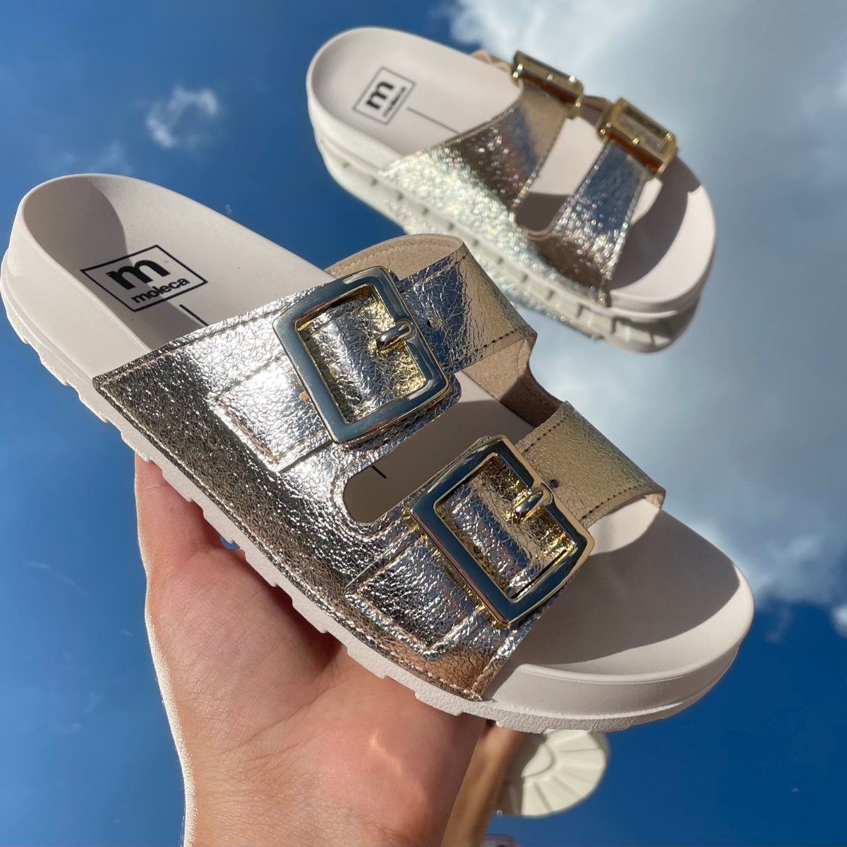 MOLECA Sempre presente no lifestyle de mulheres jovens de espírito de todas as idades, Moleca tem tudo a ver com a moda urbana que toma conta das ruas do Brasil e do mundo! Ao combinar conforto e estilo, a marca esbanja versatilidade para todos os momentos e surpreende com modelos em dia com as tendências mais quentes! O Chinelo Feminino Papete Moleca 5436.401 Dourado é lindo! Confeccionada em tecido, possui palmilha em eva, para maior conforto, solado em eva tratorado, para maior segurança e detalhes, que deixam o modelo ainda mais bonito