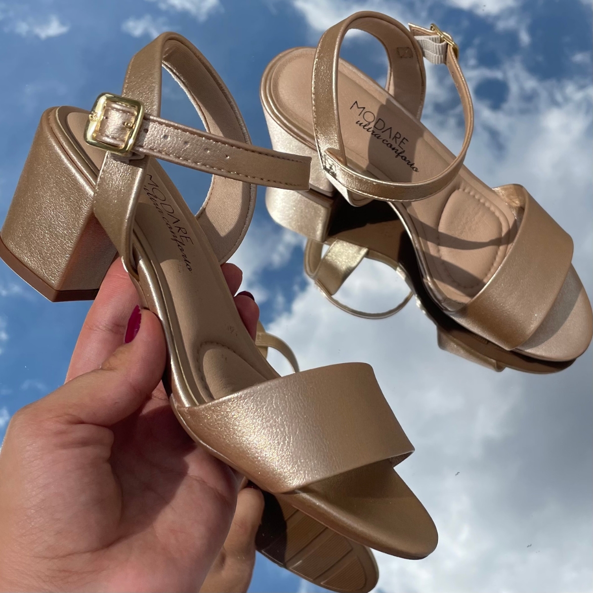 Sandália feminina Modare confeccionada em material alternativo metalizado london. Modelo com uma tira frontal e tira no tornozelo com fechamento por fivela com 7 níveis de ajuste. Salto grosso forrado com 6,5 cm de altura, solado emborrachado antiderrapante e forro em material sintético.
