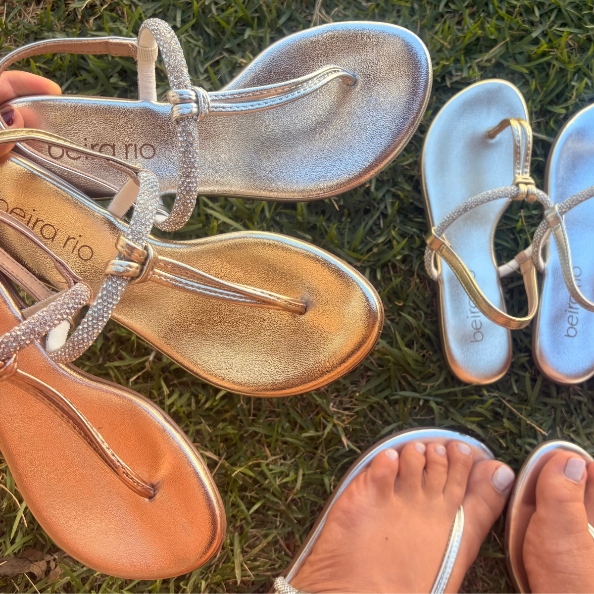 Sandália rasteira feminina da marca beira rio, com tiras finas, detalhe em strass e palmilha macia. Prática, versátil e adequada para várias ocasiões do dia a dia.