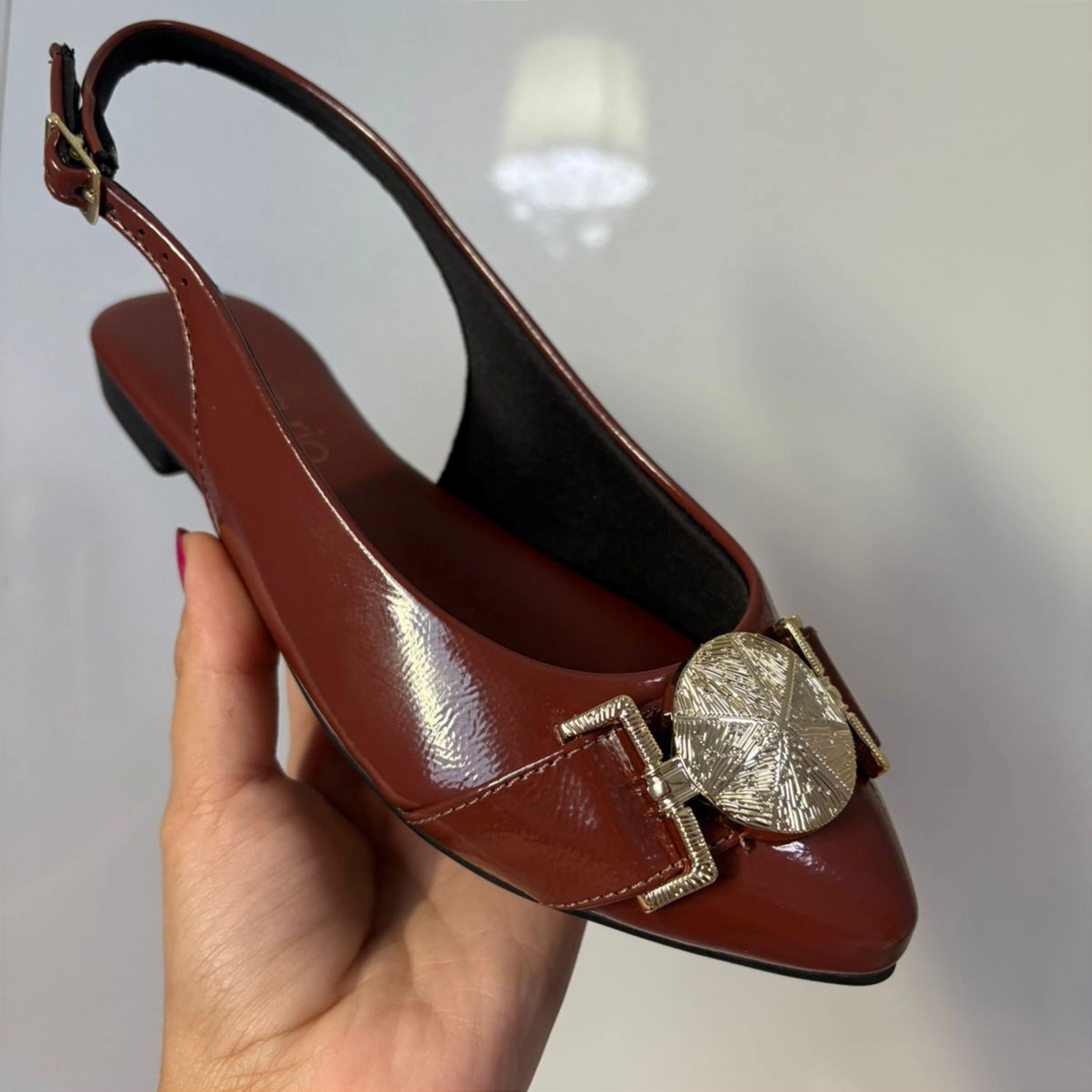 Modelo de sapato feminino da marca Beira Rio, especificamente um sapato mule com fivela. Este modelo é conhecido por combinar conforto, estilo e qualidade. O sapato também é descrito como um slinback, com design moderno e acabamento envernizado, além de uma palmilha macia para maior conforto.