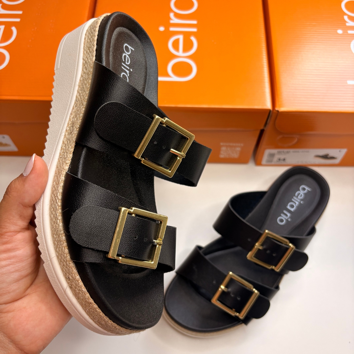 Sandália Papete Flatform Casual Feminino Beira Rio 8575.101 Marrom A Sandália Papete Beira Rio 8575.101 na cor Camel é a definição de modernidade para os seus pés. Ideal para mulheres que buscam um calçado com presença, este modelo combina a praticidade do calce fácil com o visual imponente das solas flatform, garantindo que você esteja pronta para qualquer ocasião casual com muita personalidade. Confeccionada em Napa Turim , a sandália apresenta duas tiras largas sobre o peito do pé, adornadas com fivelas douradas de tamanho generoso, que além de funcionais, atuam como elementos de design luxuosos. O tom marrom camel harmoniza perfeitamente com o acabamento lateral em corda, trazendo um ar artesanal e fresco ao calçado. Destaques do Produto Cabedal em Napa Turim : material sintético premium que oferece maciez e resistência para o uso contínuo. Design com Fivelas Duplas : detalhes metálicos dourados que conferem um toque de sofisticação e permitem um visual marcante. Solado Flatform de 5 cm : altura aproximada que proporciona elevação com total estabilidade, apresentando uma vira texturizada que remete a fibras naturais. Palmilha Sintética Confort : desenvolvida para acomodar a planta do pé com suavidade, garantindo bem-estar durante todo o dia. Calce Fácil (Mule Style) : modelo aberto atrás que oferece agilidade e conforto térmico para os dias mais quentes. Base Tratorada Segura : solado inferior na cor branca com ranhuras que garantem excelente aderência e segurança ao caminhar. ? Dica de Estilo A papete camel flatform é extremamente versátil e a cara das produções urbanas de verão. Combine-a com calças jeans de lavagem clara, shorts de sarja ou vestidos midi de malha para um visual moderno e despojado. Por possuir um tom terroso e detalhes dourados, ela transmite uma imagem de comodidade e sofisticação natural, sendo a companhia perfeita para passeios, viagens ou para dar um "up" no seu estilo cotidiano.